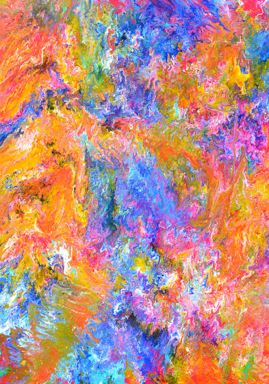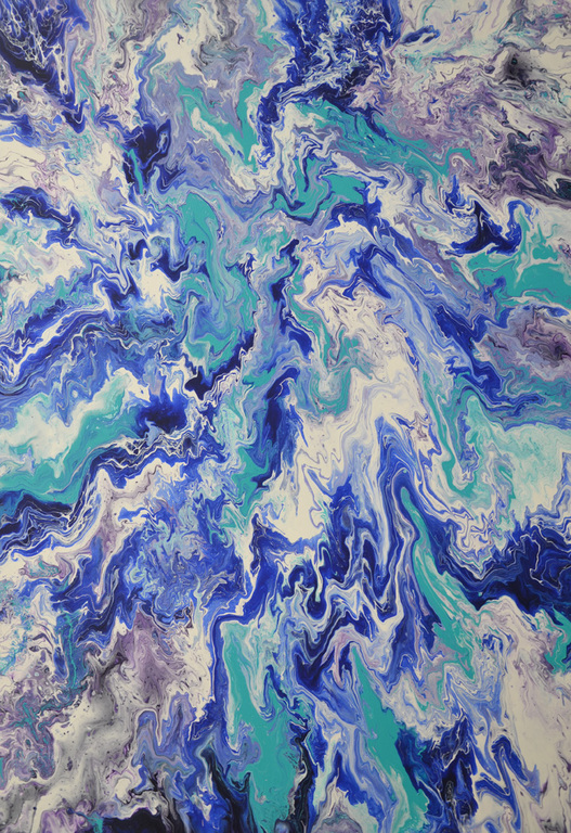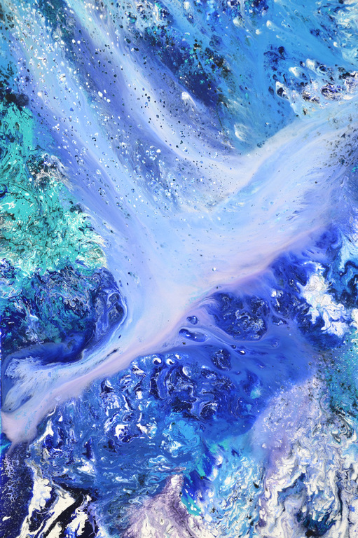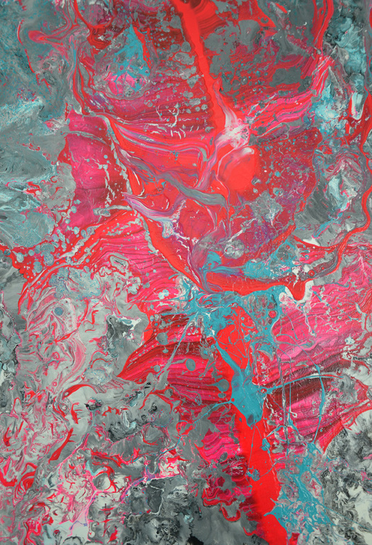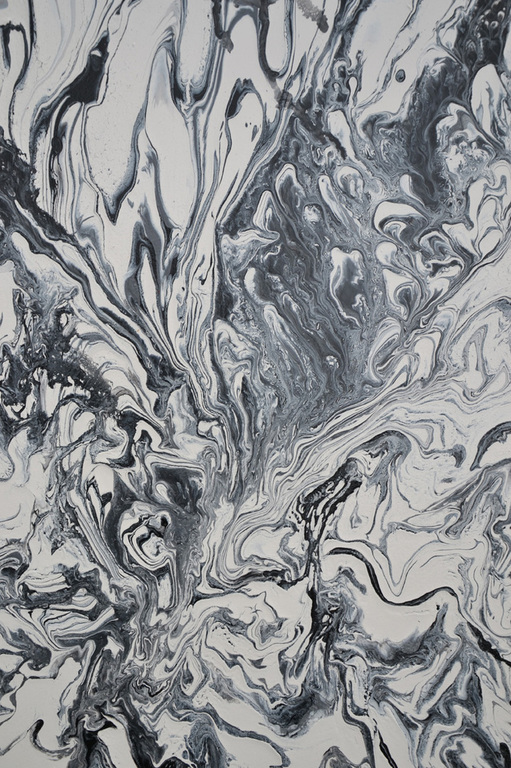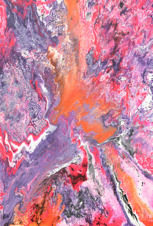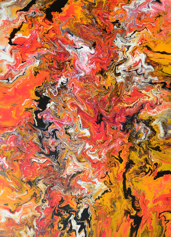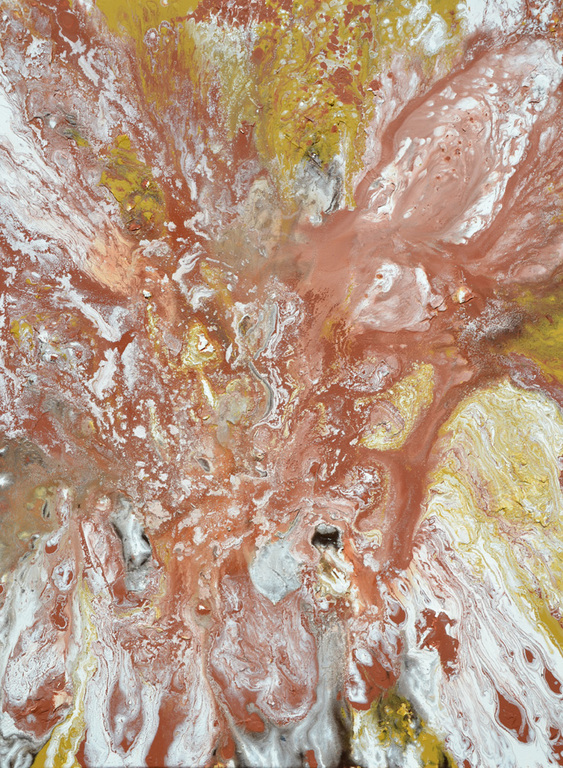 Die in Schwingung versetze Farbe fließt und strömt einerseits organisch und somit den Fluss des Lebens beinhaltend und wird andererseits kompositionell gesteuert und aktiv von der Hand des Künstlers kontrolliert. Das verblüffend einfache Prinzip dieser Bilder besteht darin, dass verschiedene Farbpfützen auf dem flach ausgebreiteten Bildträger verteilt werden und diese sich dann durch Schaukelbewegungen ,,selbsttätig“ auf der Bildfläche verteilen. Was so einfach klingt, ist in der Praxis vertrackt und im visuellen Ergebnis komplex.